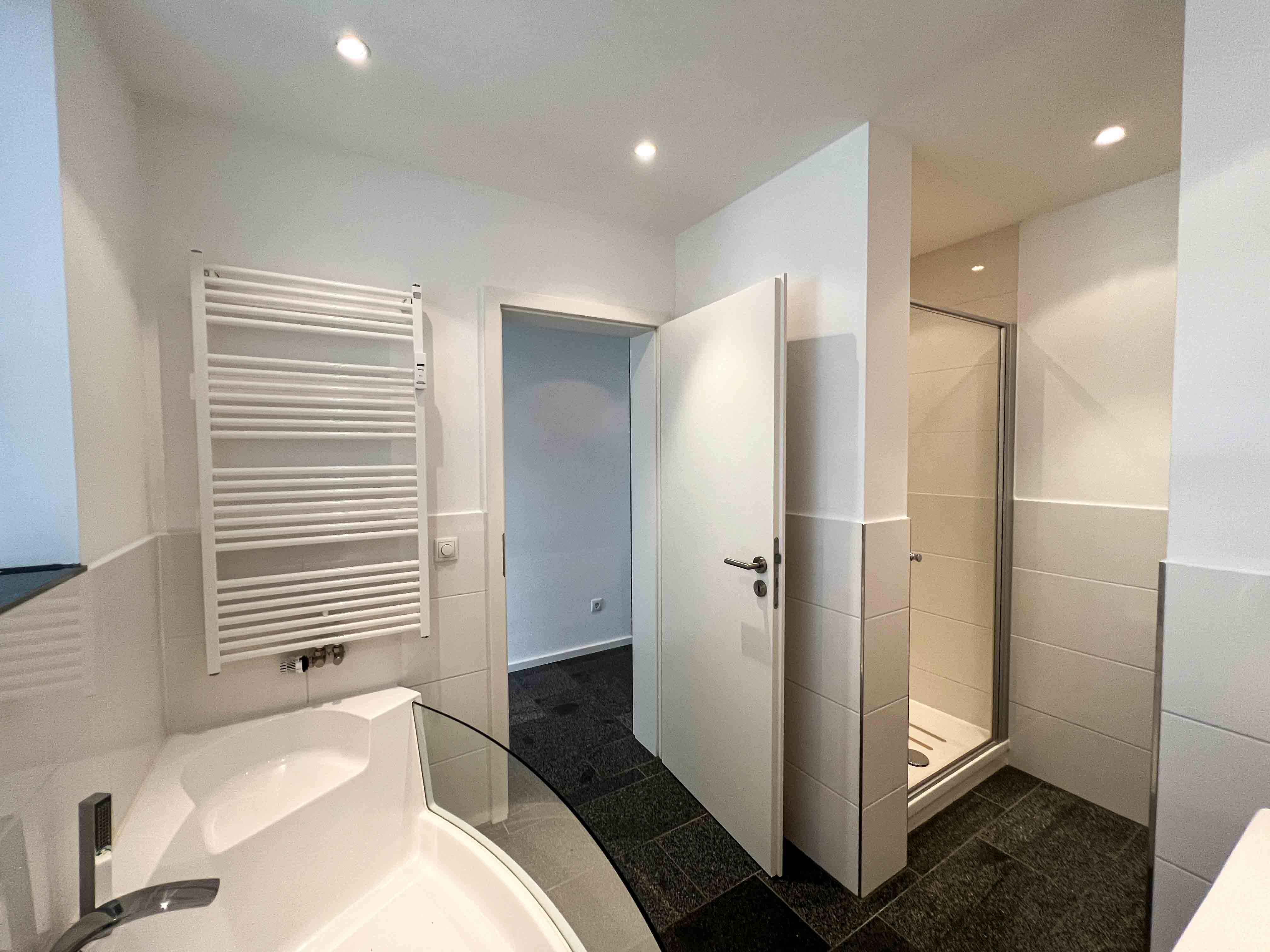 Das gepflegte und moderne Badezimmer ist mit einer komfortablen Badewanne, eigener Dusche, elegantem Waschtisch, Handtuchheizkörper und WC ausgestattet, in der Sie sich nach einem anstrengenden Tag entspannen können. Natürliches Licht dringt durch das angrenzende Zimmer in den Raum. Die Beleuchtung durch Deckenstrahler lässt das Badezimmer zudem einladend und hell wirken.