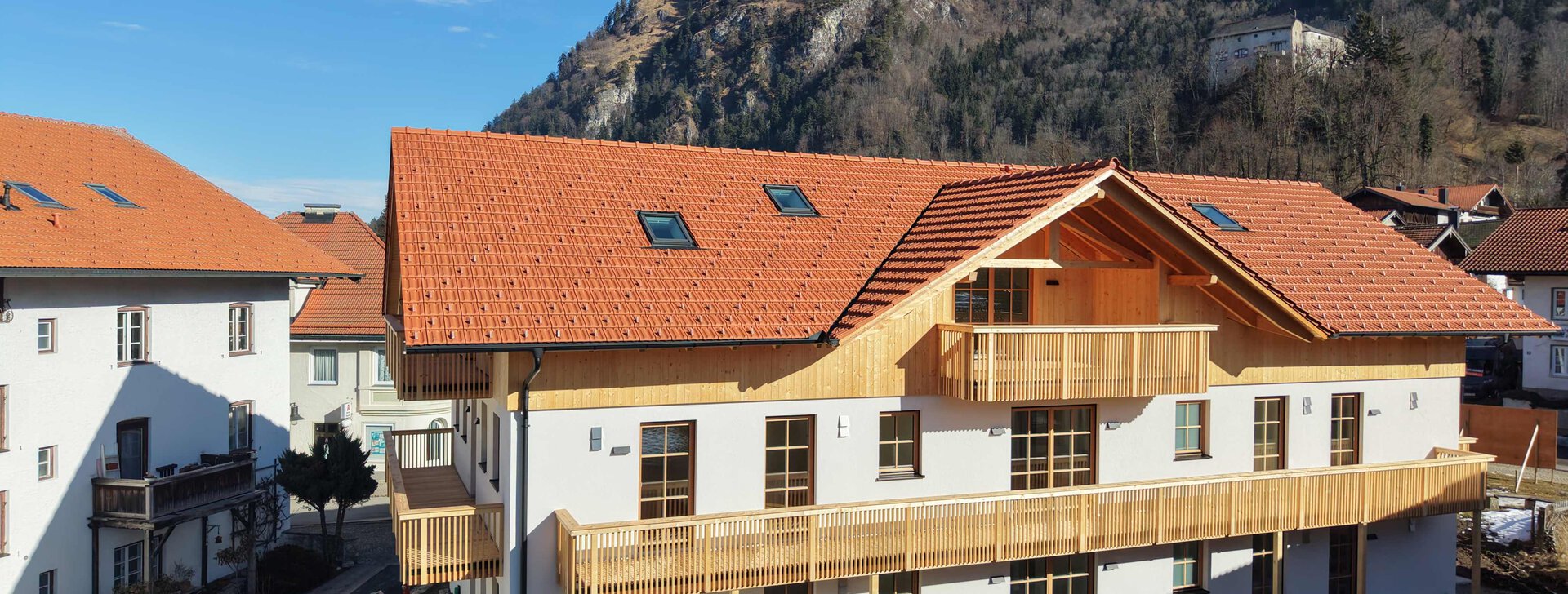 Auf drei Geschossen bietet das neu entstandene Mehrfamilienhaus mit acht Wohneinheiten Wohnkomfort für unterschiedliche Lebenslagen. Das Neubauvorhaben befindet sich in Marquartstein unweit des Erholungsgebiets an der Tiroler Arche. Das Gebäude wird in Holzbauweise mit KfW-55 Standard errichtet. Eine Besonderheit am Haus ist die vor dem Haupteingang stehende Kapelle, welche im Zuge des Baues des Neubauvorhabens stilecht saniert wird.