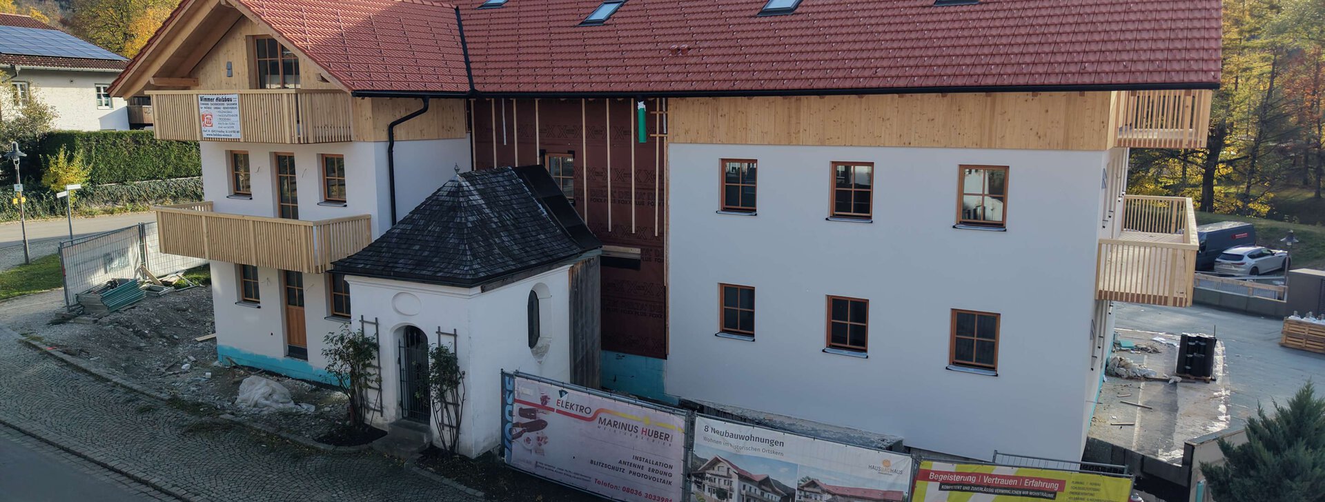Auf drei Geschossen bietet das neu entstehende Mehrfamilienhaus mit acht Wohneinheiten Wohnkomfort für unterschiedliche Lebenslagen. Das Neubauvorhaben befindet sich in Marquartstein unweit des Erholungsgebiets an der Tiroler Arche. Das Gebäude wird in Holzbauweise mit KfW-55 Standard errichtet. Eine Besonderheit am Haus ist die vor dem Haupteingang stehende Kapelle, welche im Zuge des Baues des Neubauvorhabens stilecht saniert wird.