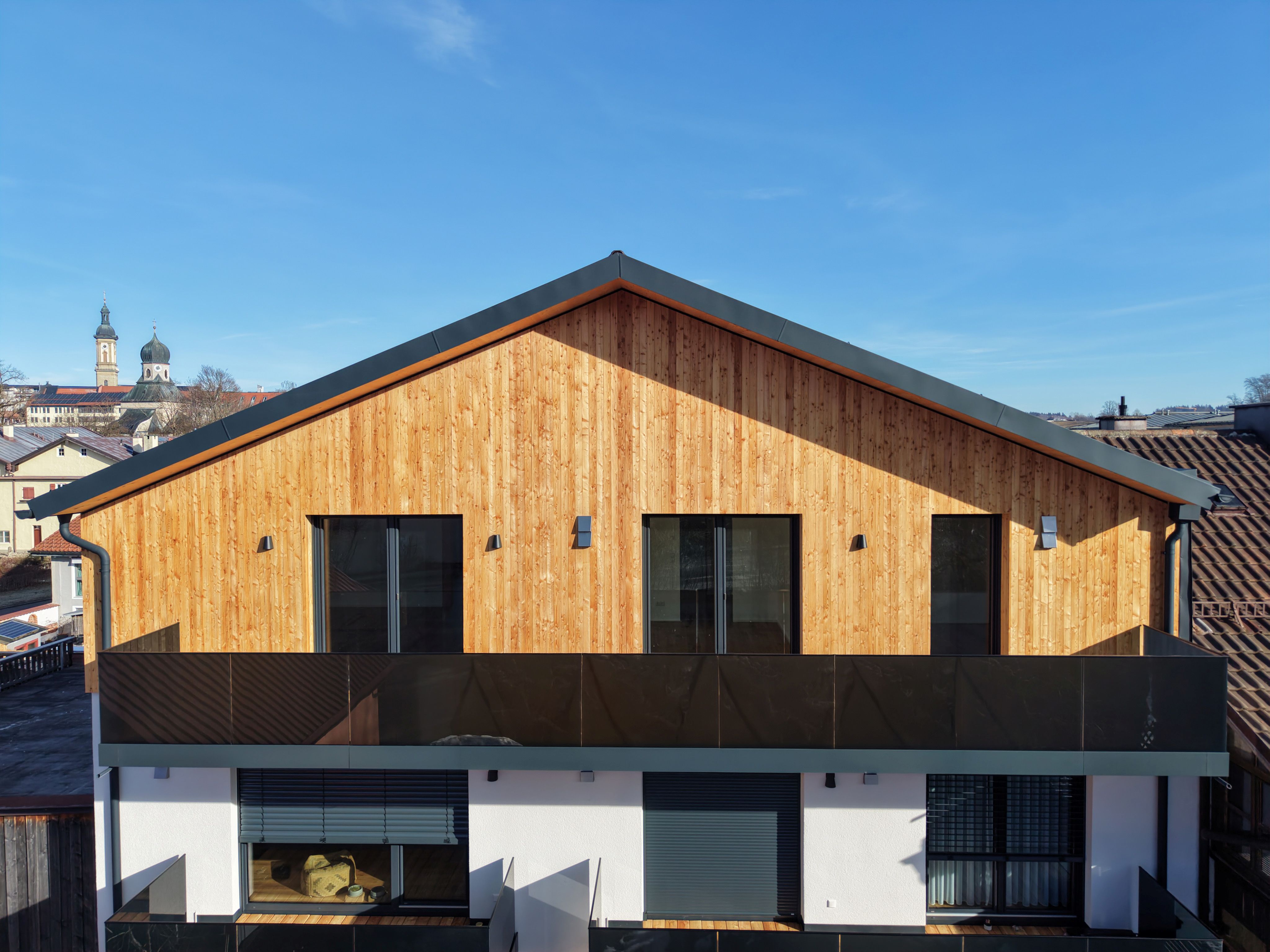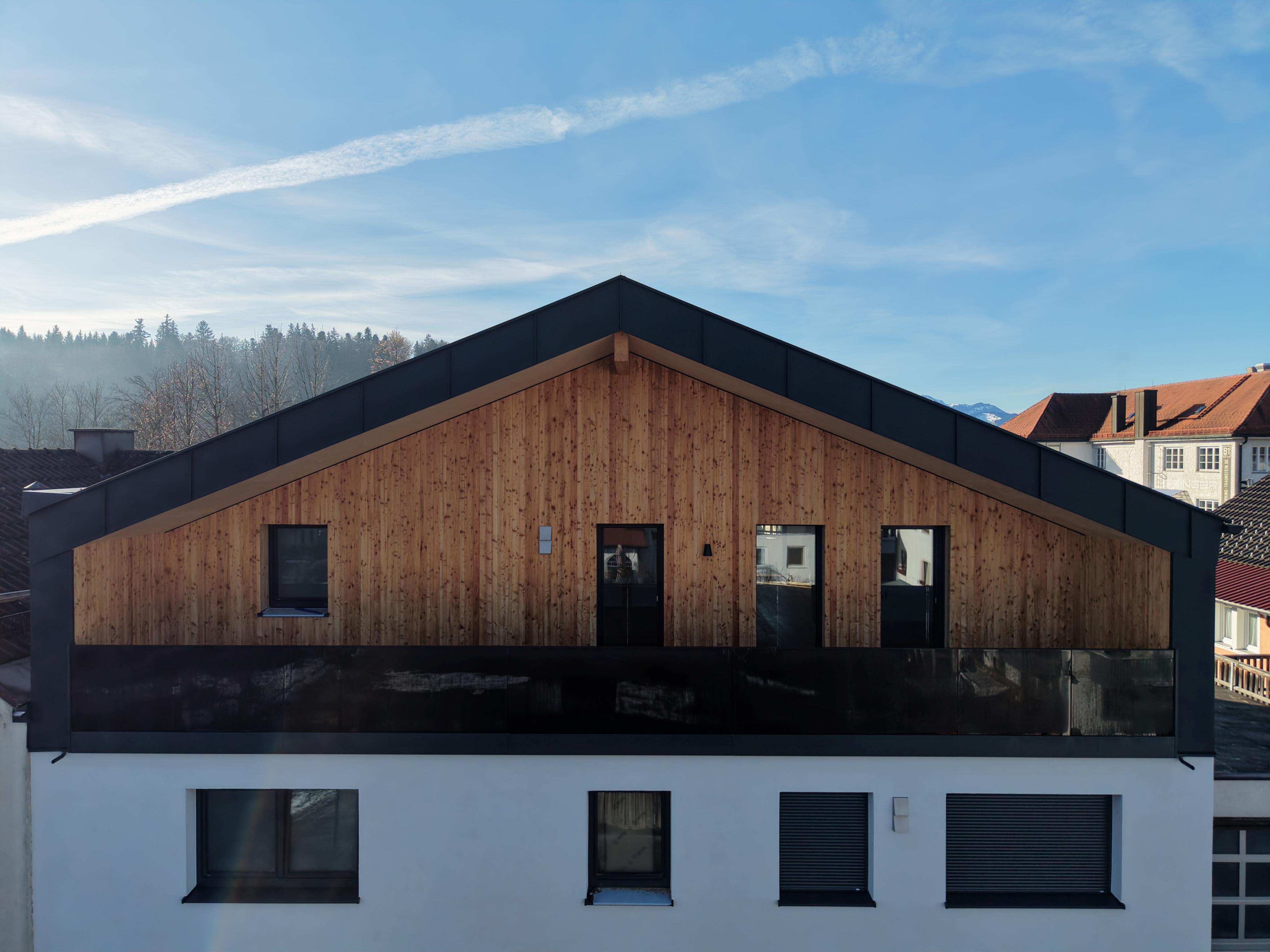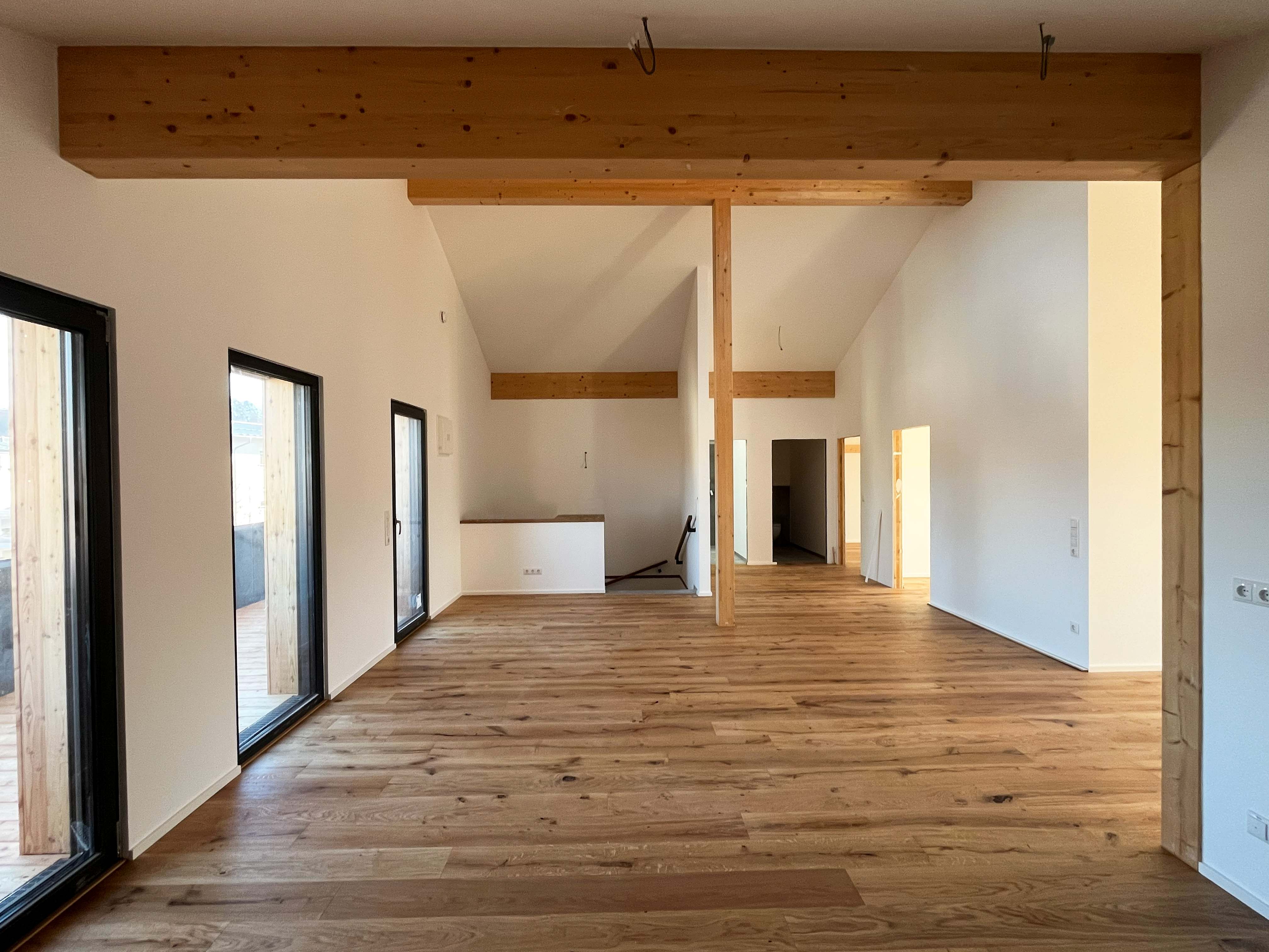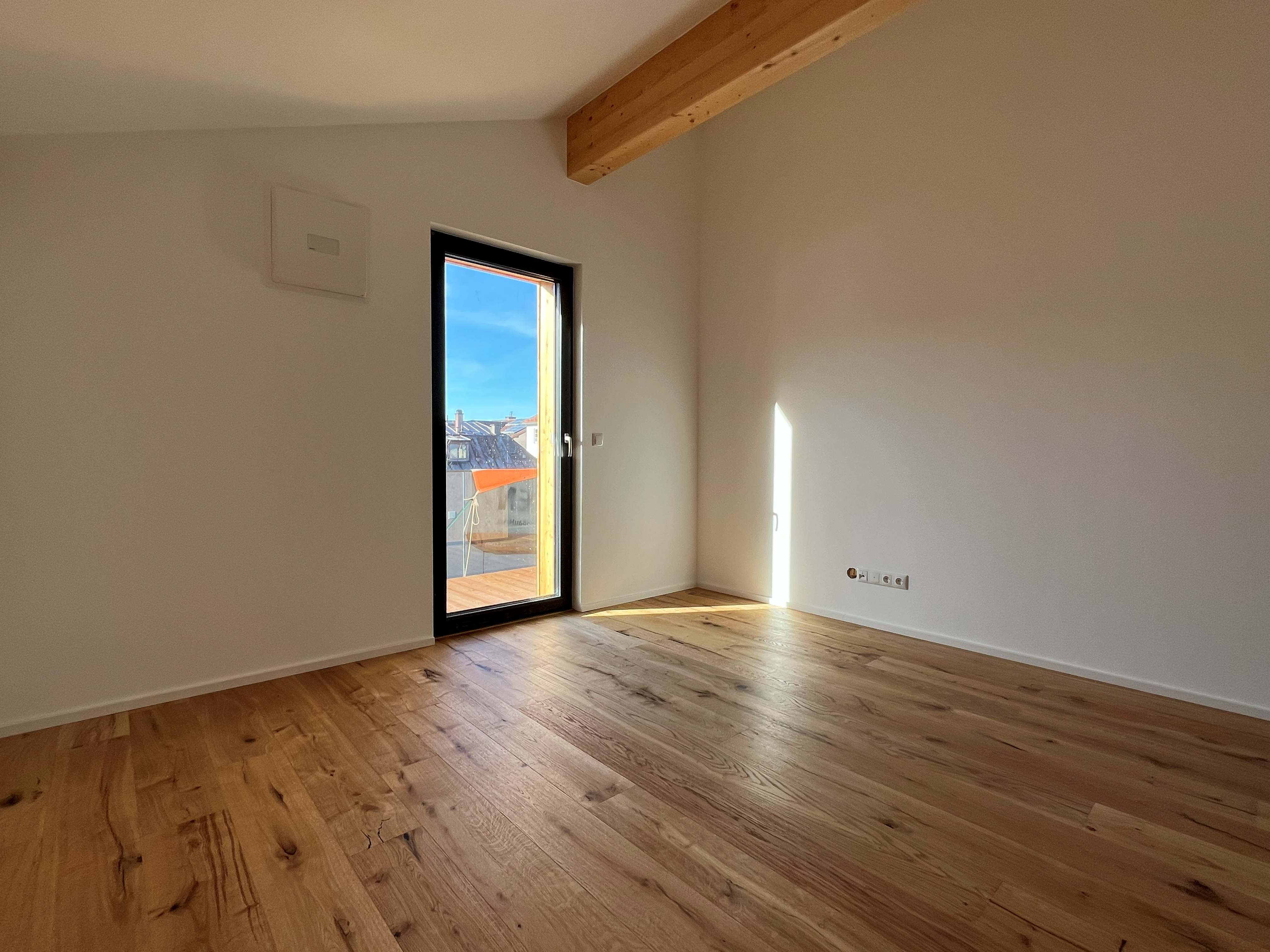 Die offene 3-Zimmer-Wohnung im Dachgeschoss erstreckt sich über die gesamte dritte Ebene. Die Balkone auf der Südseite ermöglichen es, die Sonne den ganzen Tag im Freien zu genießen. Die Dachterrasse auf der Nordseite bietet einen eindrucksvollen Blick auf die Altstadt Traunsteins mit der Pfarrkirche St. Oswald. Die modern gestalteten Schlafzimmer und das großzügige Badezimmer stellen einen Ort der Ruhe und des Komforts dar.