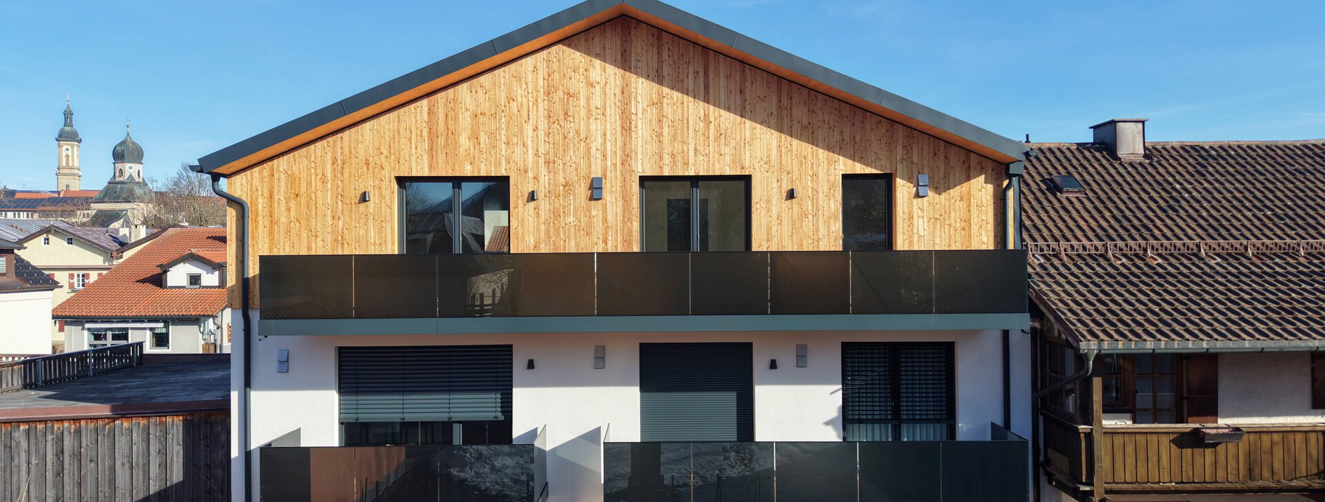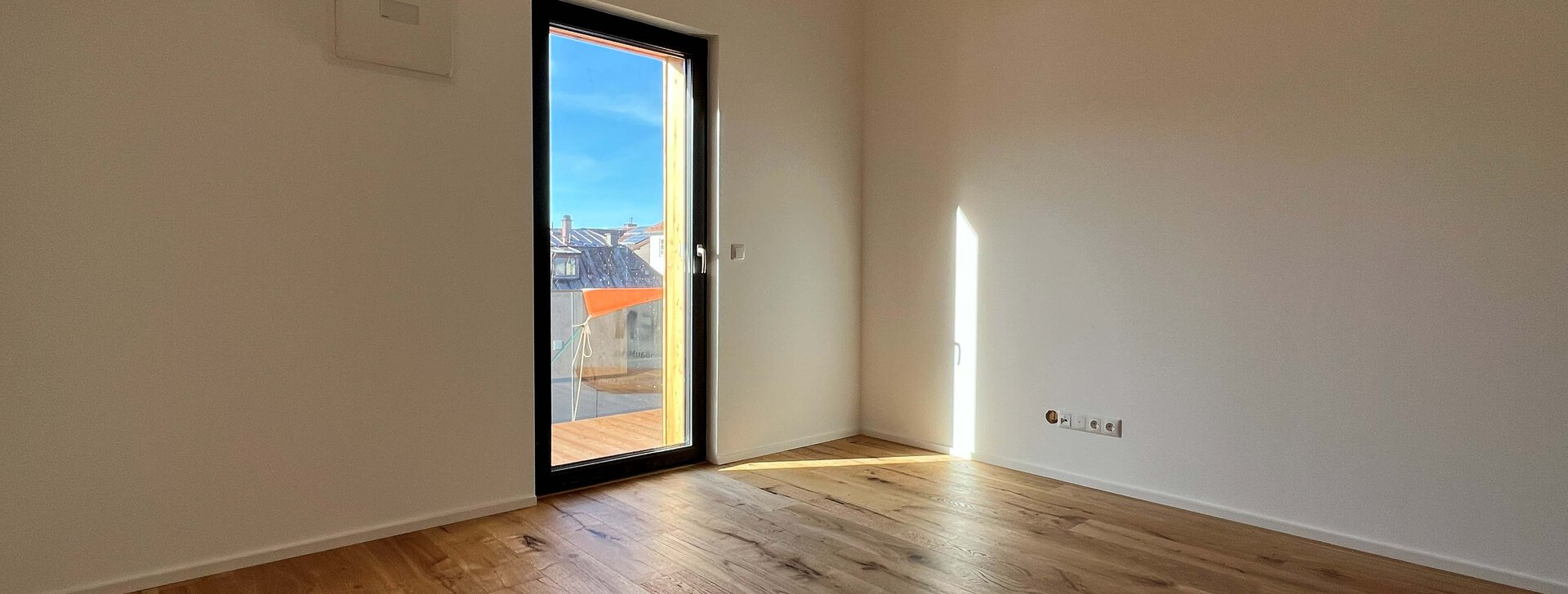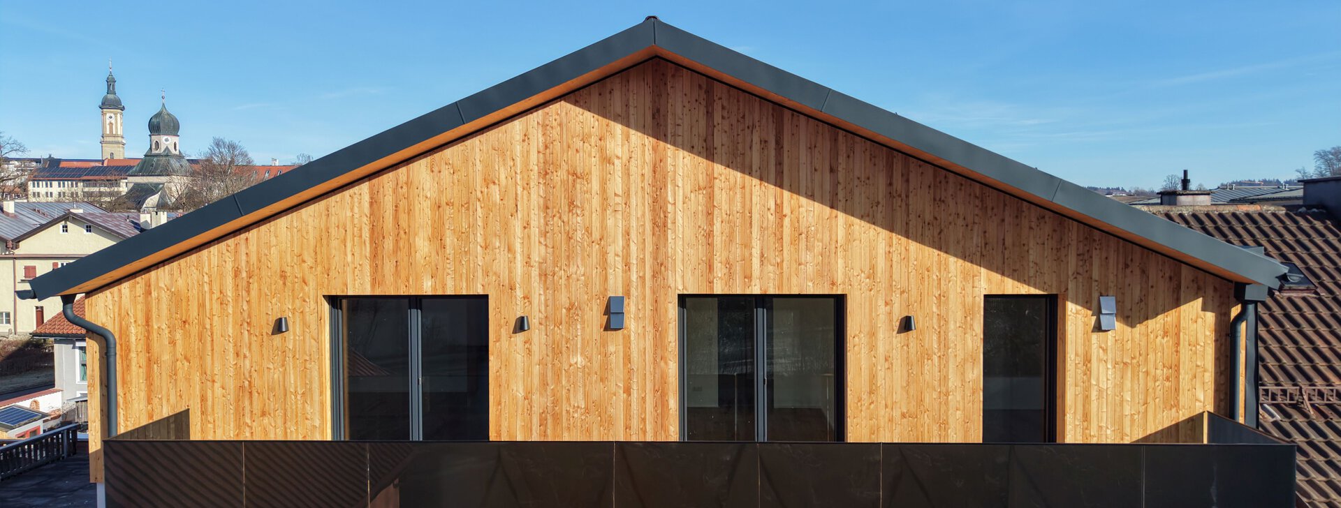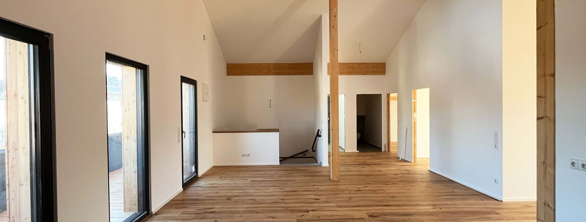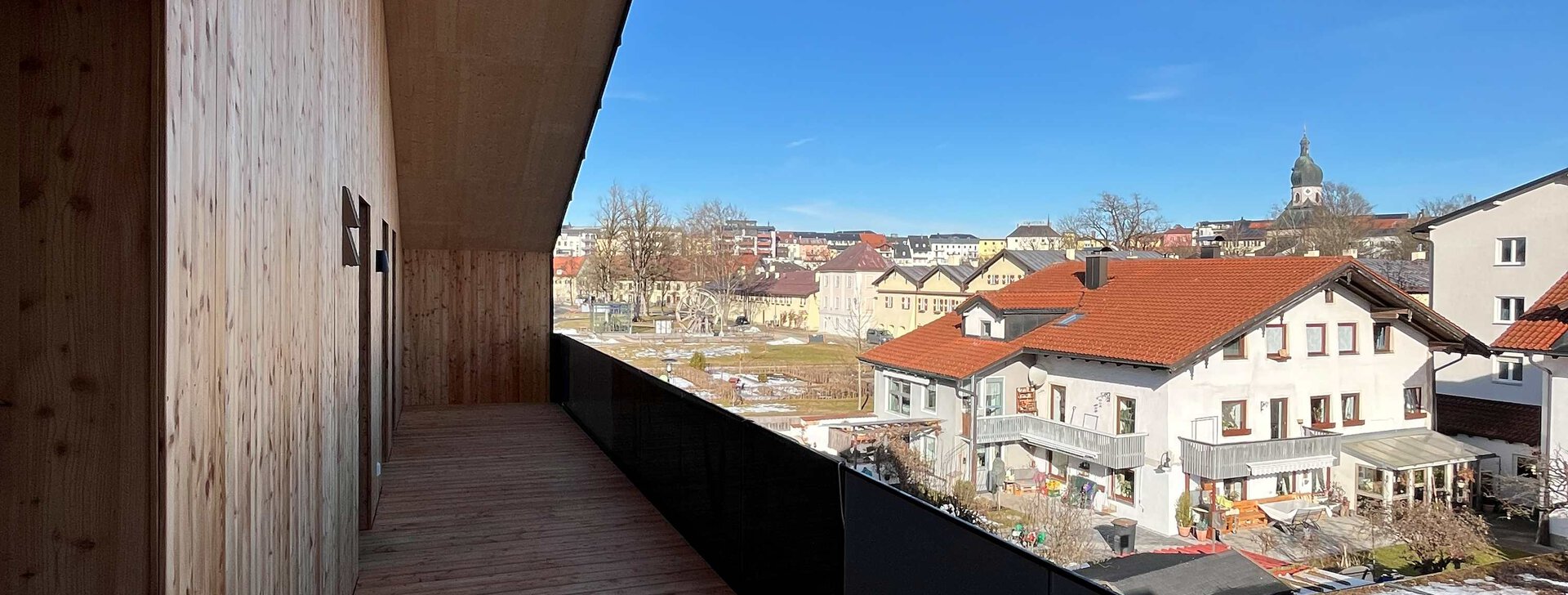 Die offene 3-Zimmer-Wohnung im Dachgeschoss erstreckt sich über die gesamte dritte Ebene. Die Balkone auf der Südseite ermöglichen es, die Sonne den ganzen Tag im Freien zu genießen. Die Dachterrasse auf der Nordseite bietet einen eindrucksvollen Blick auf die Altstadt Traunsteins mit der Pfarrkirche St. Oswald. Die modern gestalteten Schlafzimmer und das großzügige Badezimmer stellen einen Ort der Ruhe und des Komforts dar.