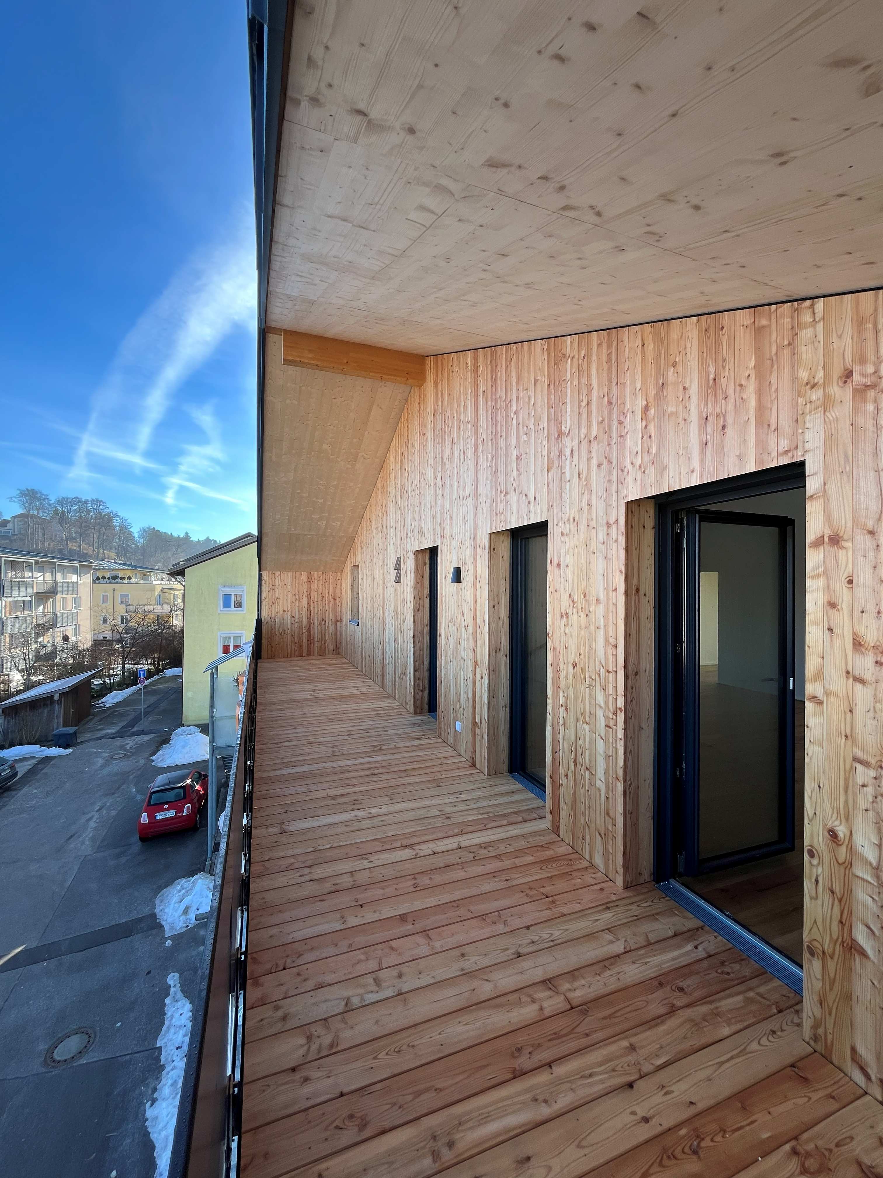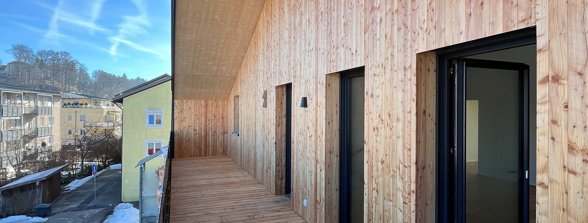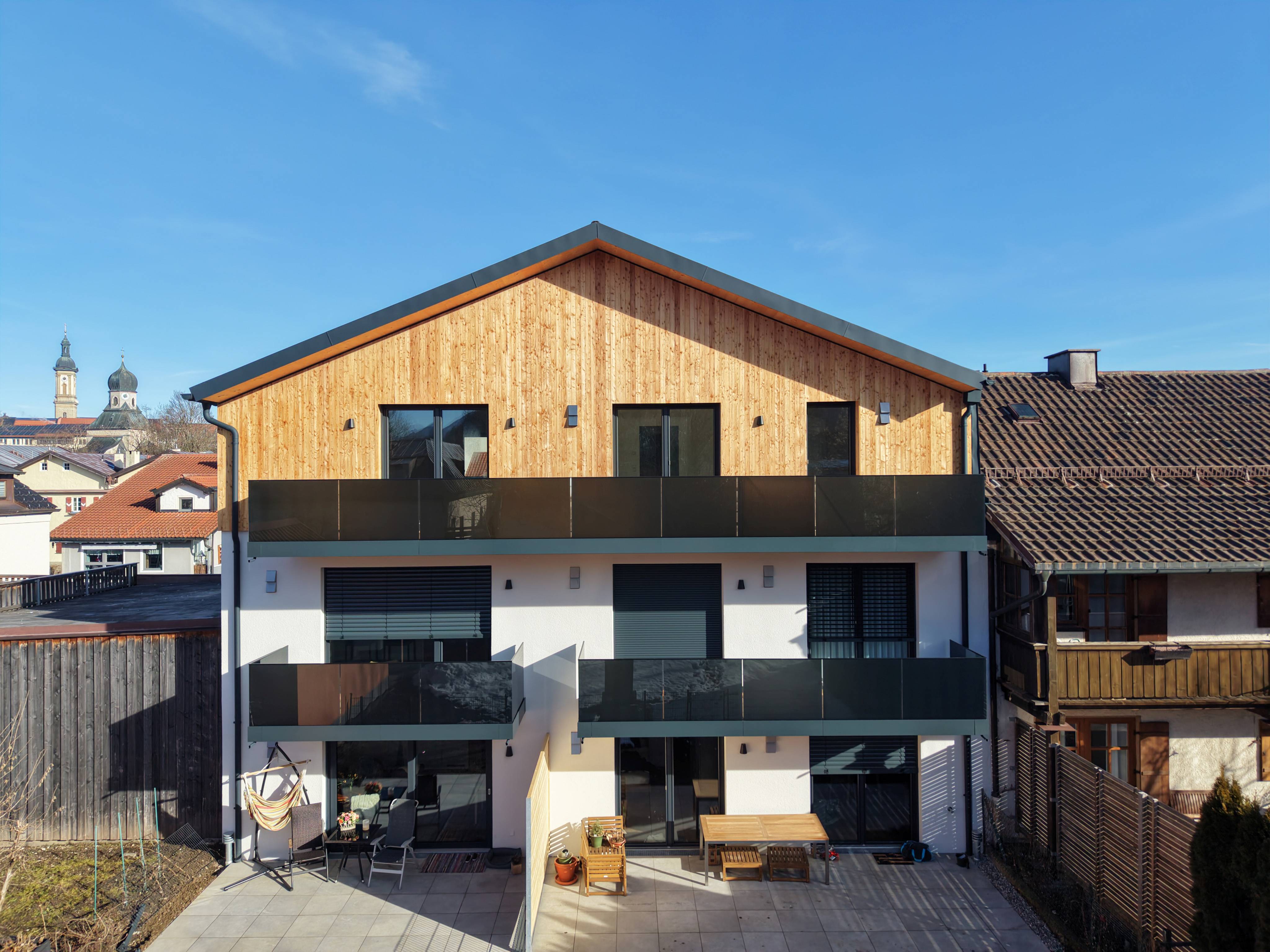 Es erstrecken sich fünf großzügige Wohneinheiten über drei Geschosse in dem Neubau in Massivholzbauweise, zwei davon sind barrierefrei gestaltet. Das als Energieeffizienzhaus 40 konzipierte Gebäude setzt mit der Luft-Wärme-Pumpe in Verbindung mit einer Fußbodenheizung den aktuellen Standard für zukunftsfähiges Wohnen um.