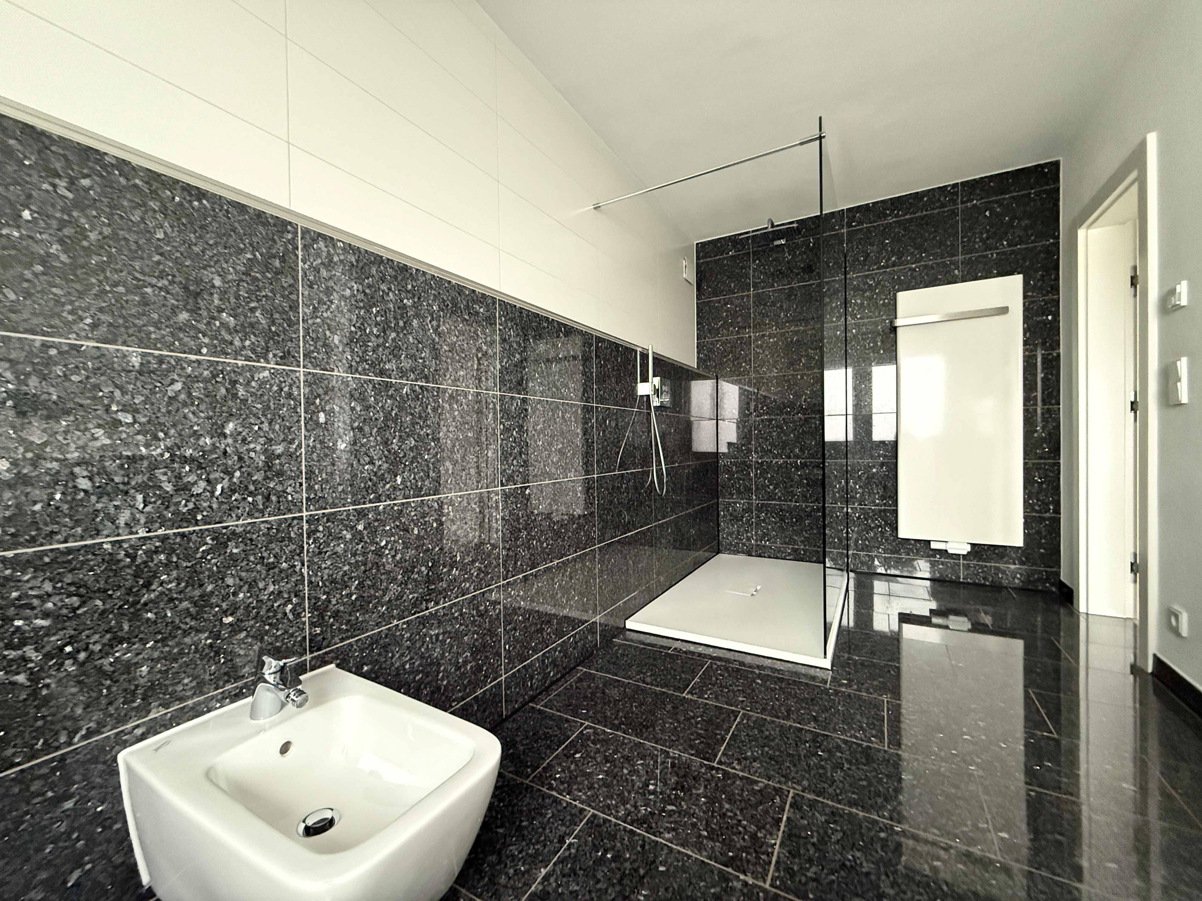 Das Tageslichtbadezimmer ist elegant gestaltet und bietet mit einem Waschbecken, einem WC, einem Bidet sowie einer großzügigen Dusche mit Regenwasserduschkopf hohen Komfort. Ein elektrischer Heizkörper sorgt zusätzlich für angenehme Wärme. Direkt angrenzend befindet sich ein praktischer Waschraum, der mit einem kleinen Waschbecken sowie einem Stellplatz für Waschmaschine und Trockner ausgestattet ist.