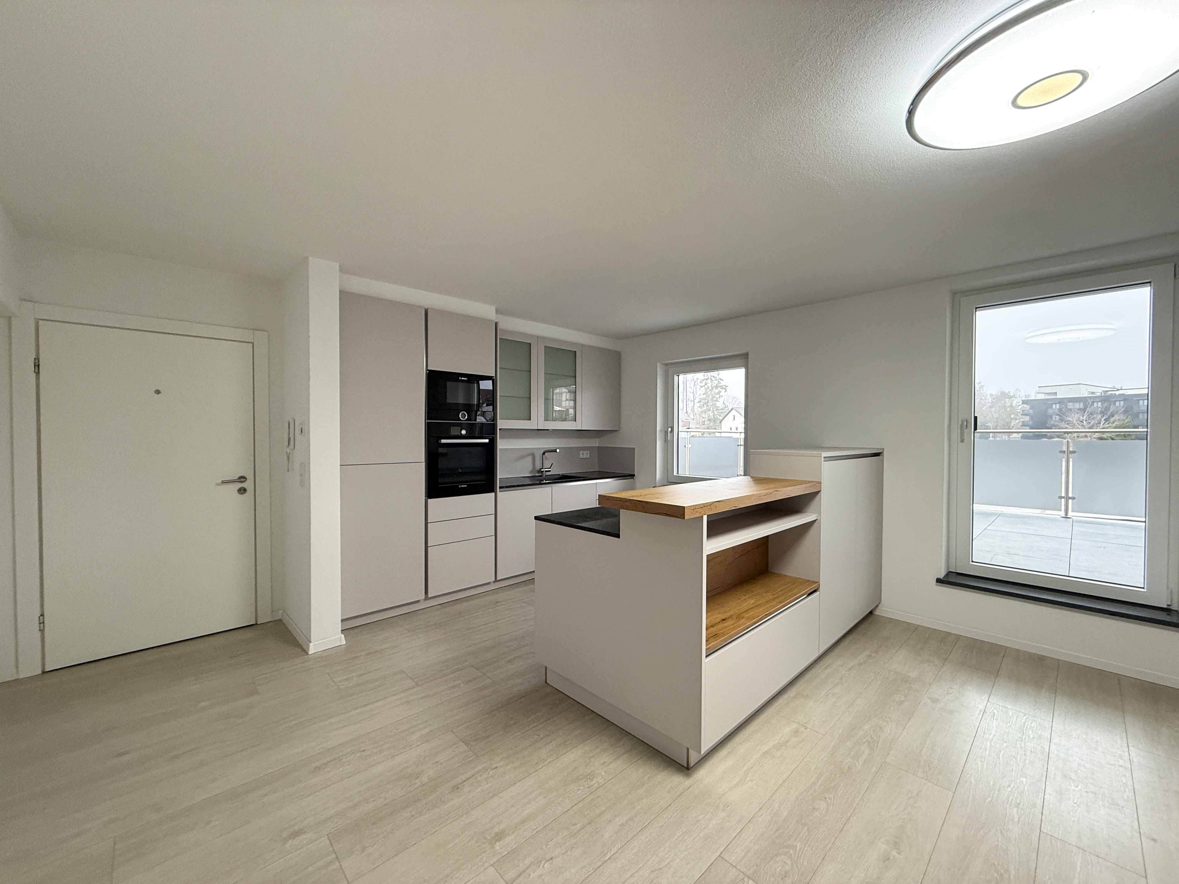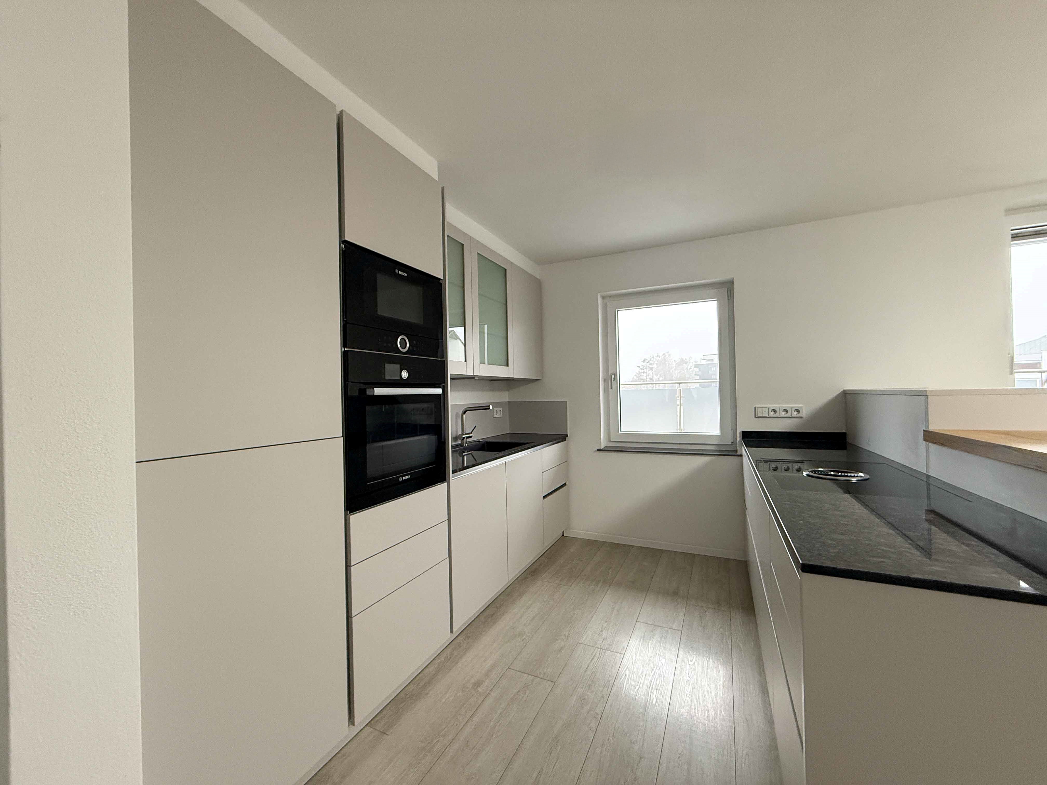 Bereits beim Betreten der Wohnung empfängt Sie ein heller, weitläufiger Wohn- und Essbereich, der durch seine moderne Gestaltung und die großen Fensterfronten eine besonders angenehme Atmosphäre schafft. Die hochwertige Einbauküche fügt sich harmonisch in den Raum ein und überzeugt mit hellen Fronten, edlen Granit-Arbeitsplatten, einem Bora-Kochfeld, Bosch-Geräten wie Mikrowelle und Backofen sowie einem großen Kühl- und Gefrierschrank. Hier lassen sich kulinarische Ideen mühelos umsetzen.