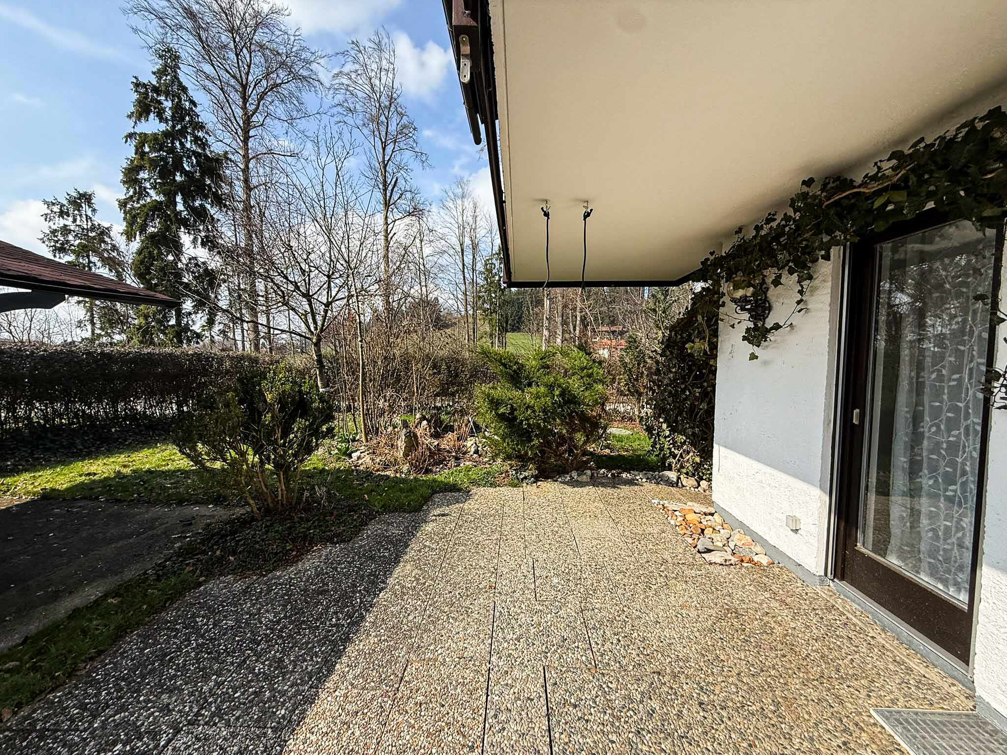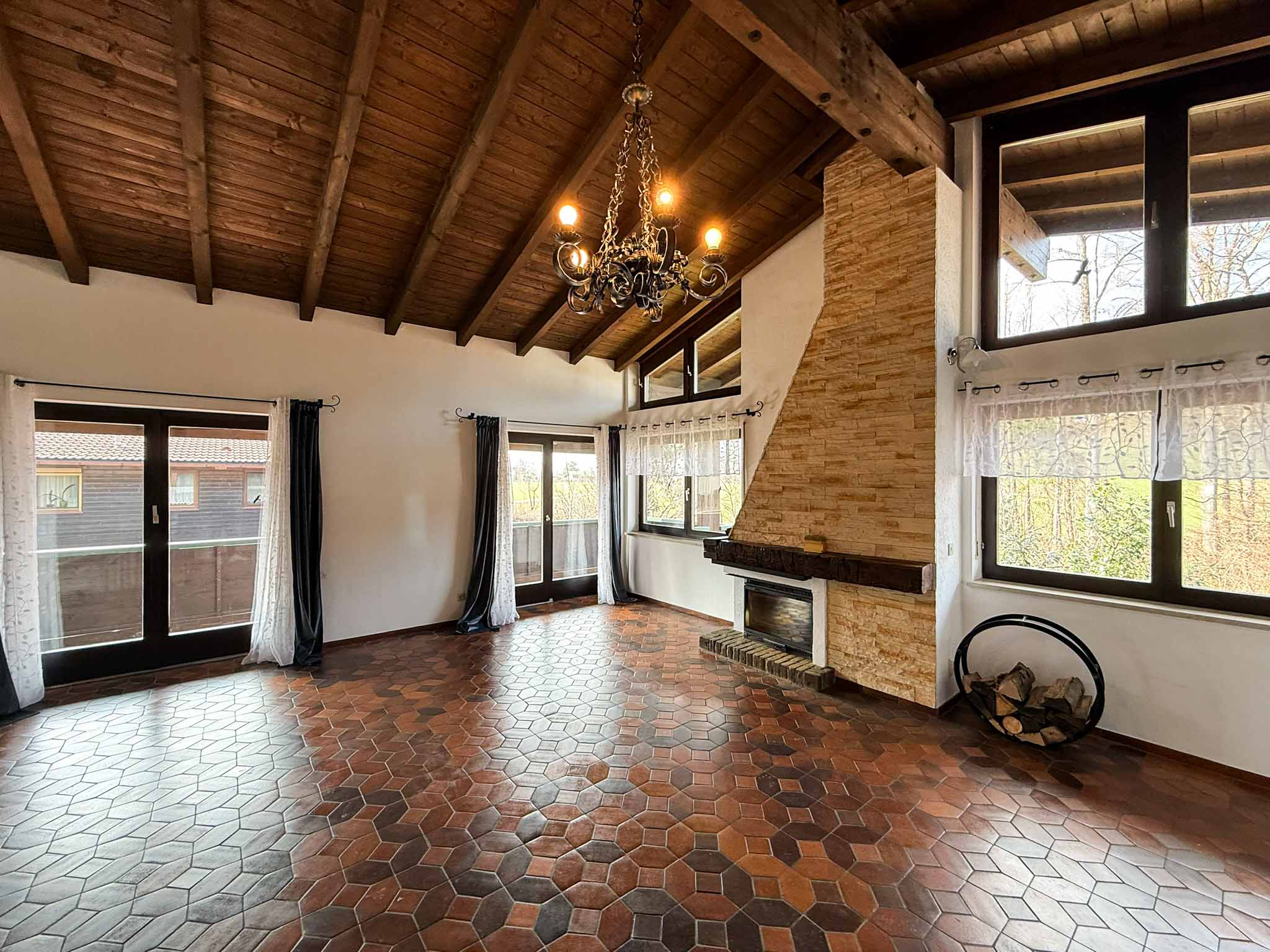 Im Obergeschoss liegt das großzügige Wohnzimmer, das durch seine helle und freundliche Gestaltung zum Mittelpunkt des Hauses wird. Besonderes Highlight ist hier der Kamin, der an kühlen Tagen eine warme, behagliche Atmosphäre schafft und den Wohnbereich zu einem echten Wohlfühlort macht. Von hier aus gelangt man auf den Balkon, der einen schönen Ausblick ins Grüne und auf die Berge bietet – ideal, um den Feierabend ruhig ausklingen zu lassen. Die Küche ist separat gehalten und bietet Platz für eine kleine Essecke. Auch auf dieser Ebene befindet sich ein weiteres WC, was den Wohnkomfort zusätzlich erhöht.