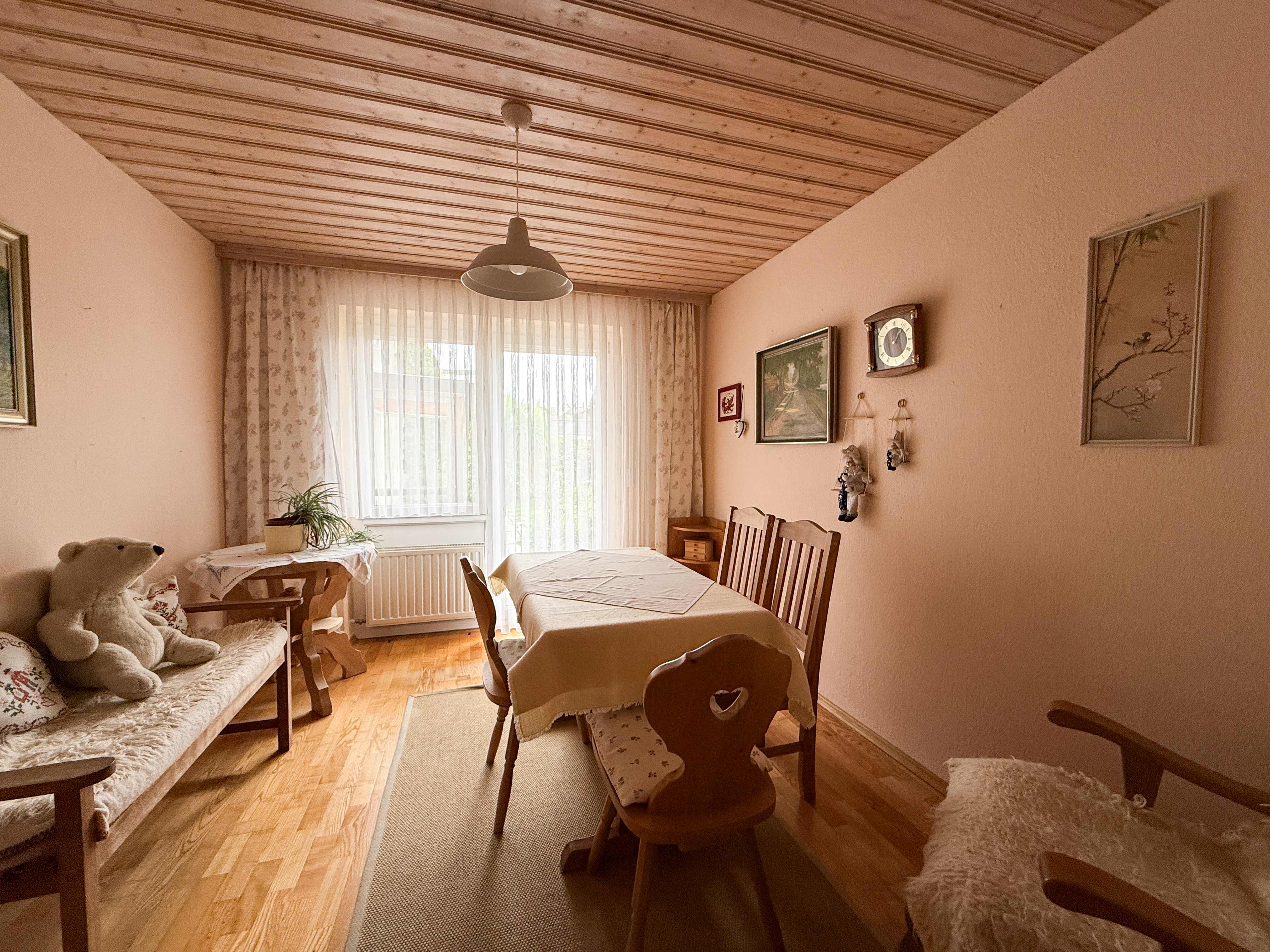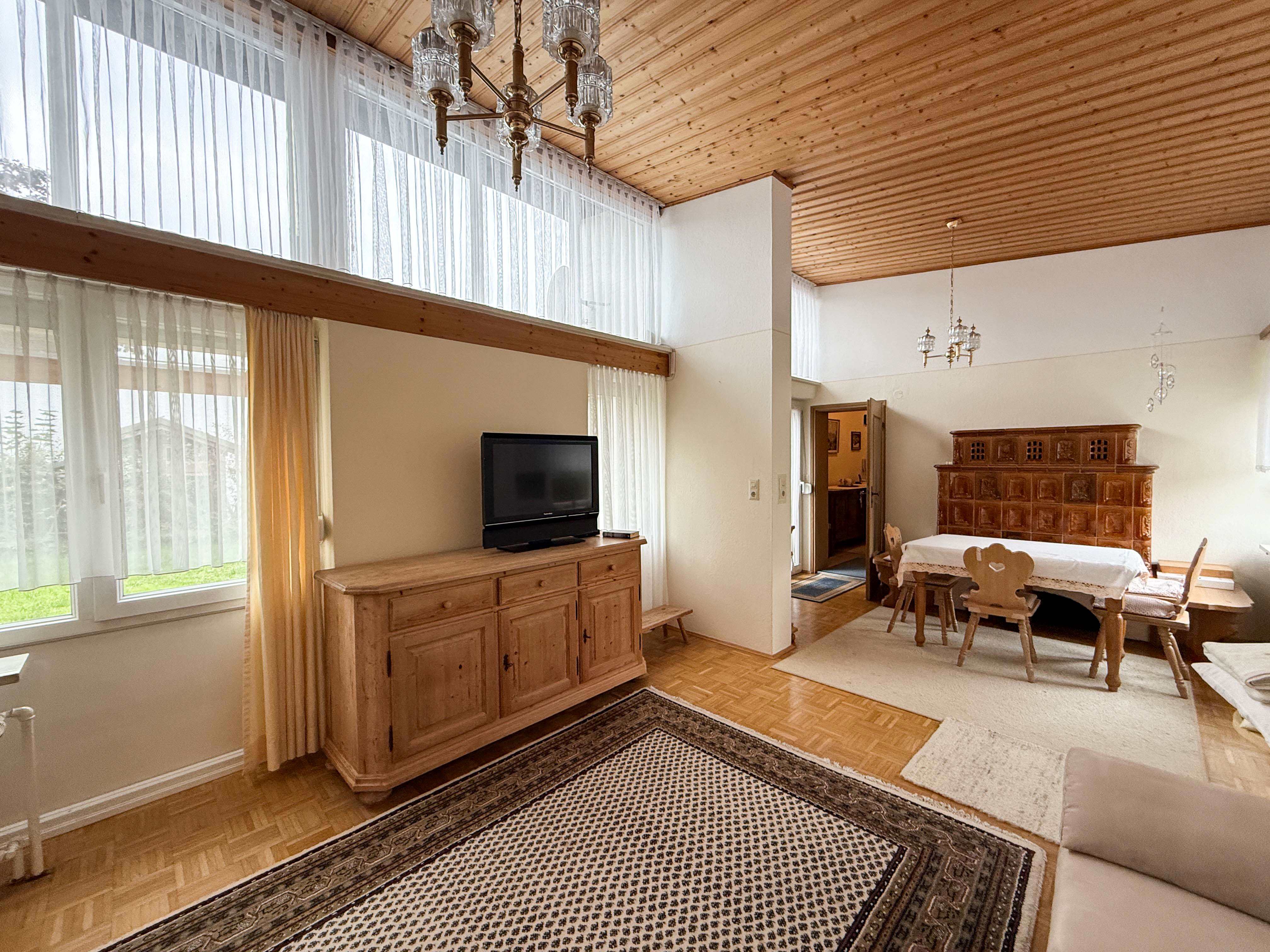 Schon beim Betreten des Hauses über den Windfang spürt man den einladenden Charakter dieses Hauses. Das Herzstück der Immobilie ist das lichtdurchflutete und großzügige Wohnzimmer, das mit einem schönen Kachelofen für wohlige Wärme und eine behagliche Atmosphäre sorgt. Von hier aus gelangen Sie direkt auf die sonnige Terrasse, die gemeinsam mit dem gepflegten Garten zum Entspannen im Freien einlädt.