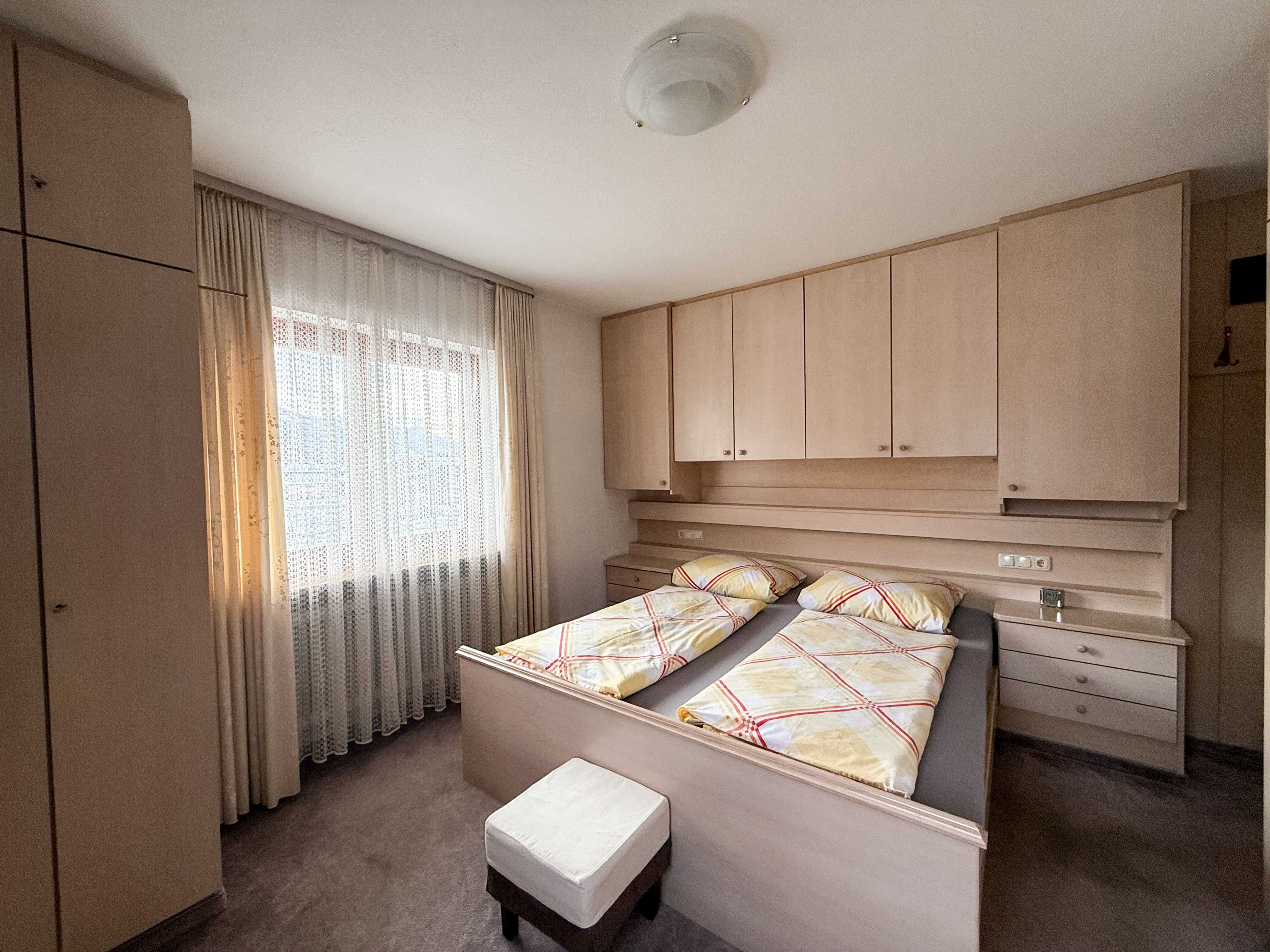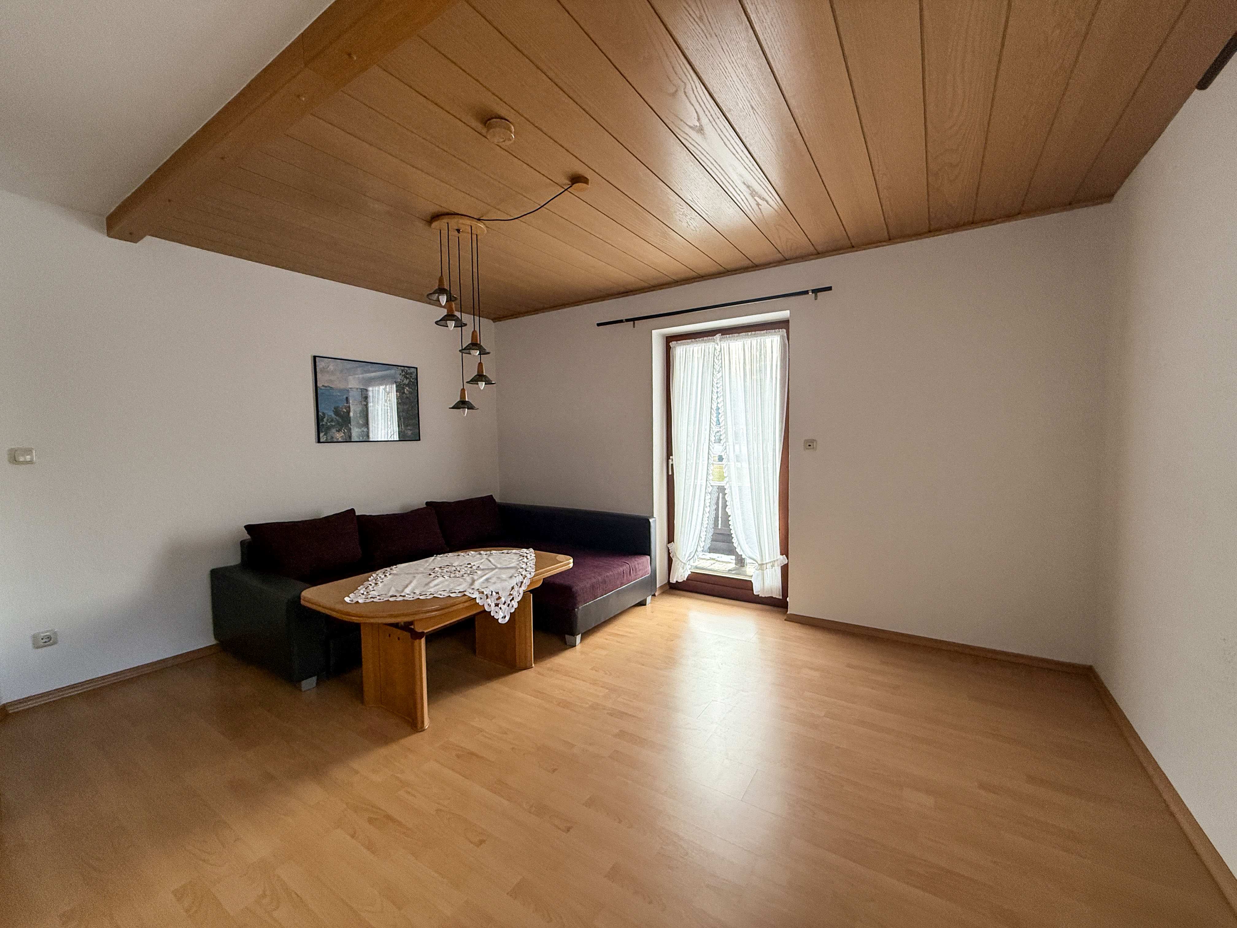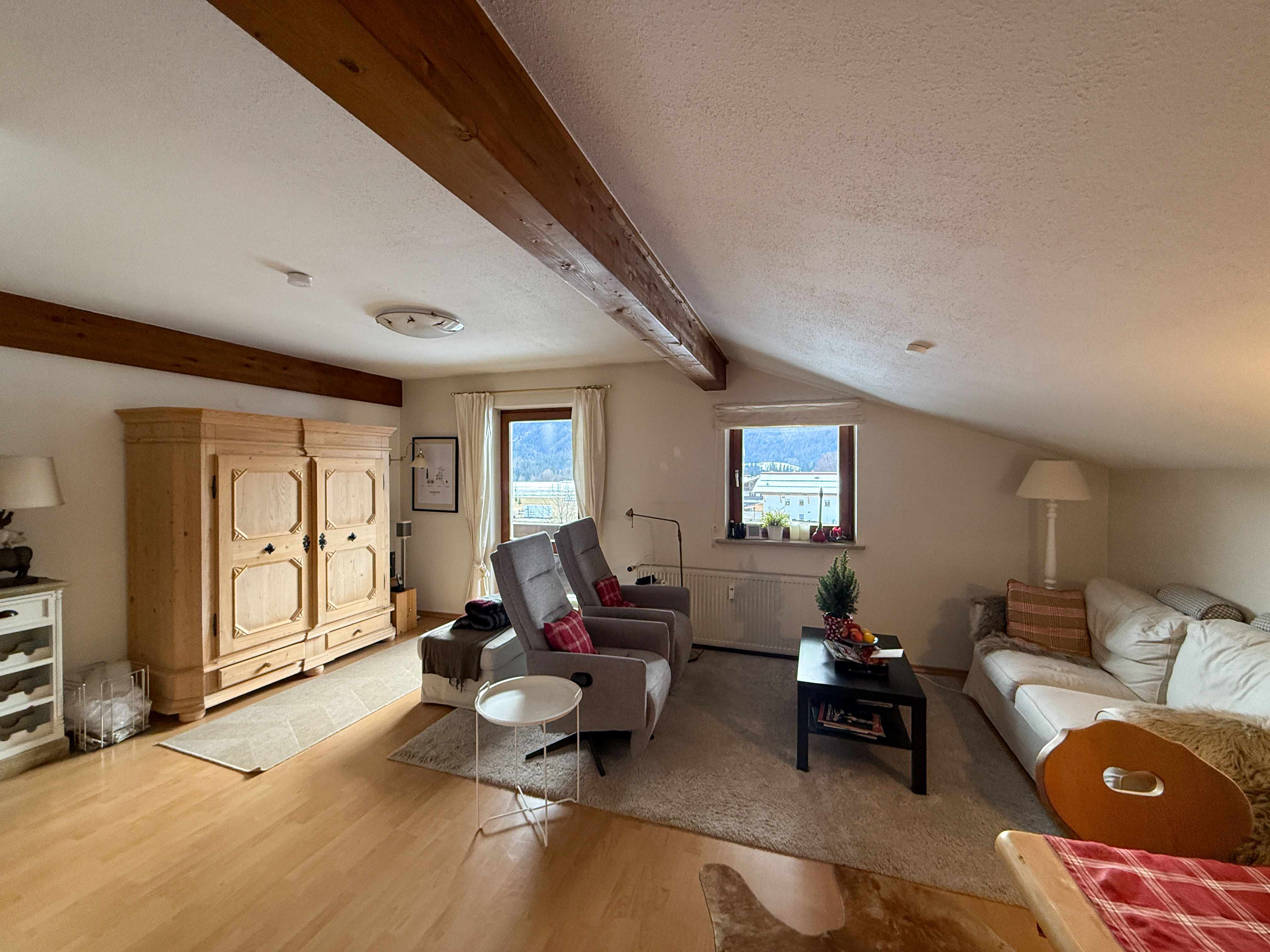 Das Obergeschoss beherbergt eine weitere 3-Zimmer-Wohnung sowie ein separat zugängliches 1-Zimmer-Appartement. Die 3-Zimmer-Wohnung verfügt über zwei großzügige, lichtdurchflutete Räume, die derzeit als Wohn- und Schlafzimmer genutzt werden. Mittelpunkt der Wohnung ist der geräumige Essbereich mit Küche. Von sämtlichen Räumen aus besteht Zugang zum umlaufenden Balkon, der einen reizvollen Ausblick auf die umliegende Berglandschaft bietet. Ein Abstellraum, der derzeit als Abstellkammer genutzt wird, verfügt über vorhandene Anschlussleitungen, die bei Bedarf den Einbau eines zusätzlichen Gäste-WCs ermöglicht. Das Badezimmer ist mit Dusche, Waschbecken und WC ausgestattet.