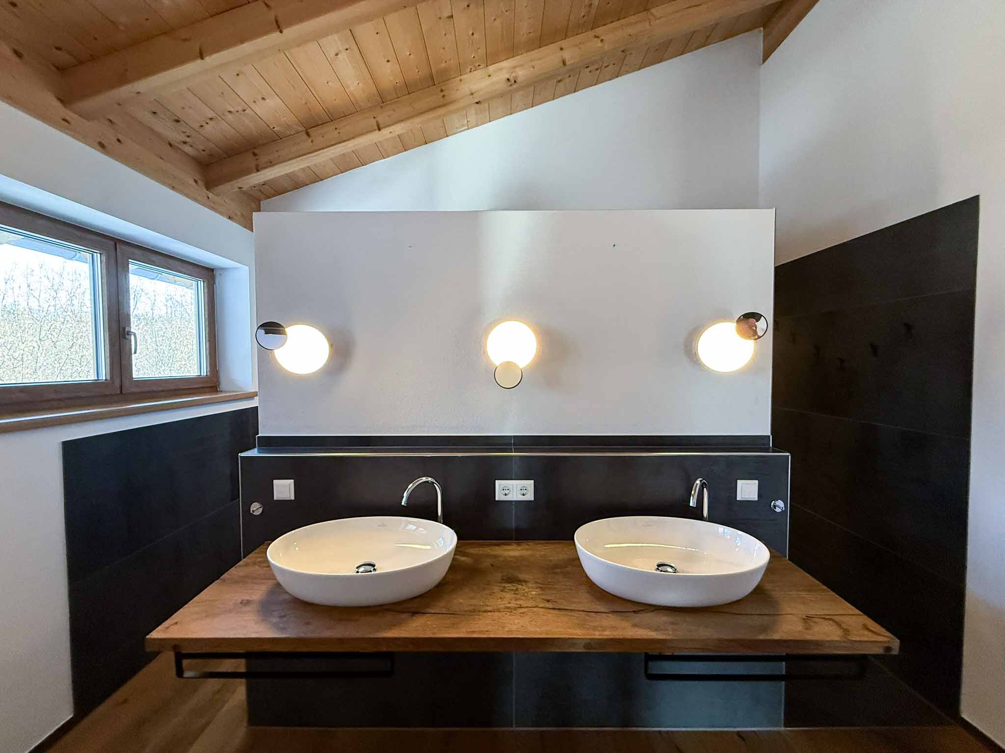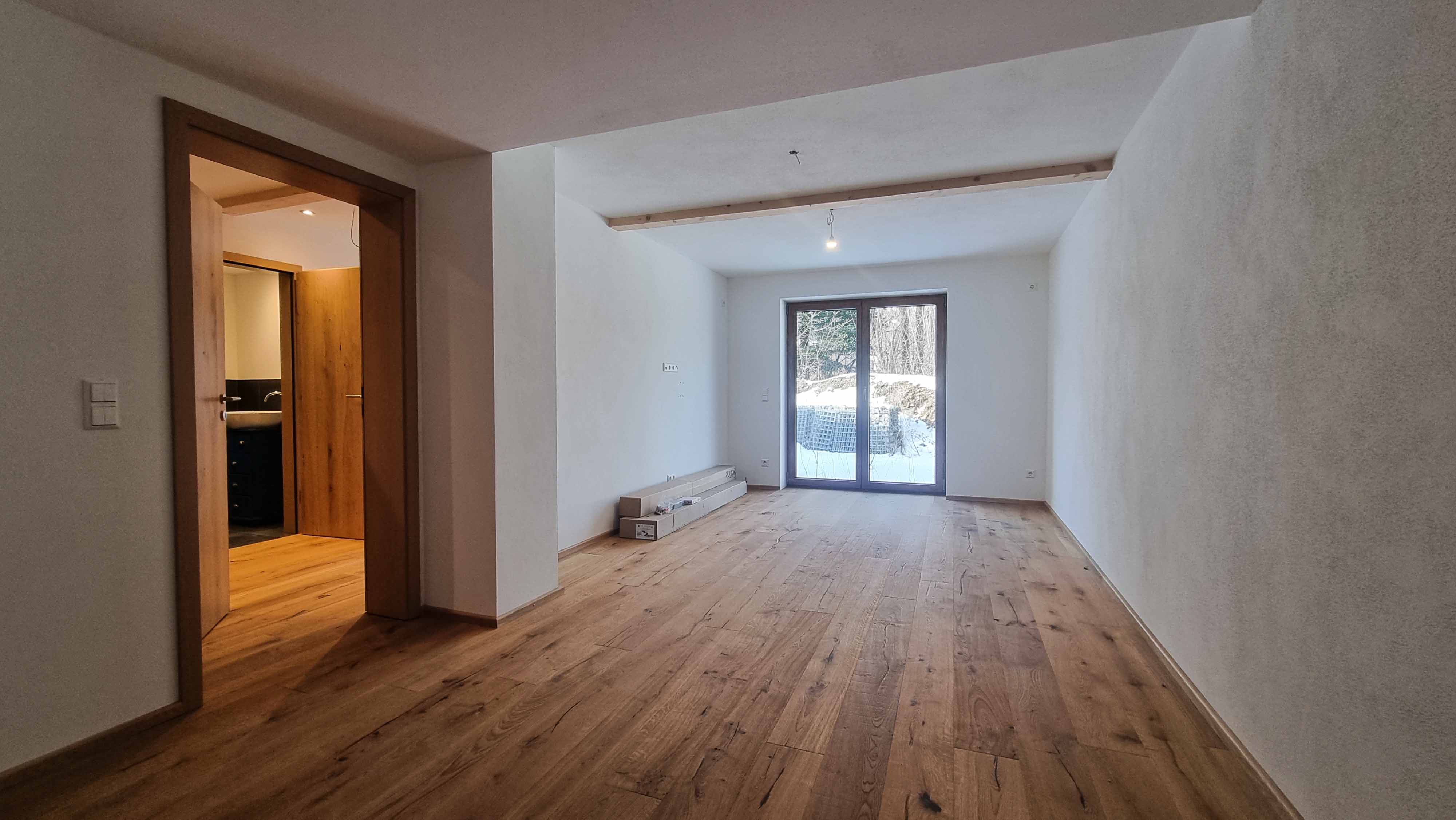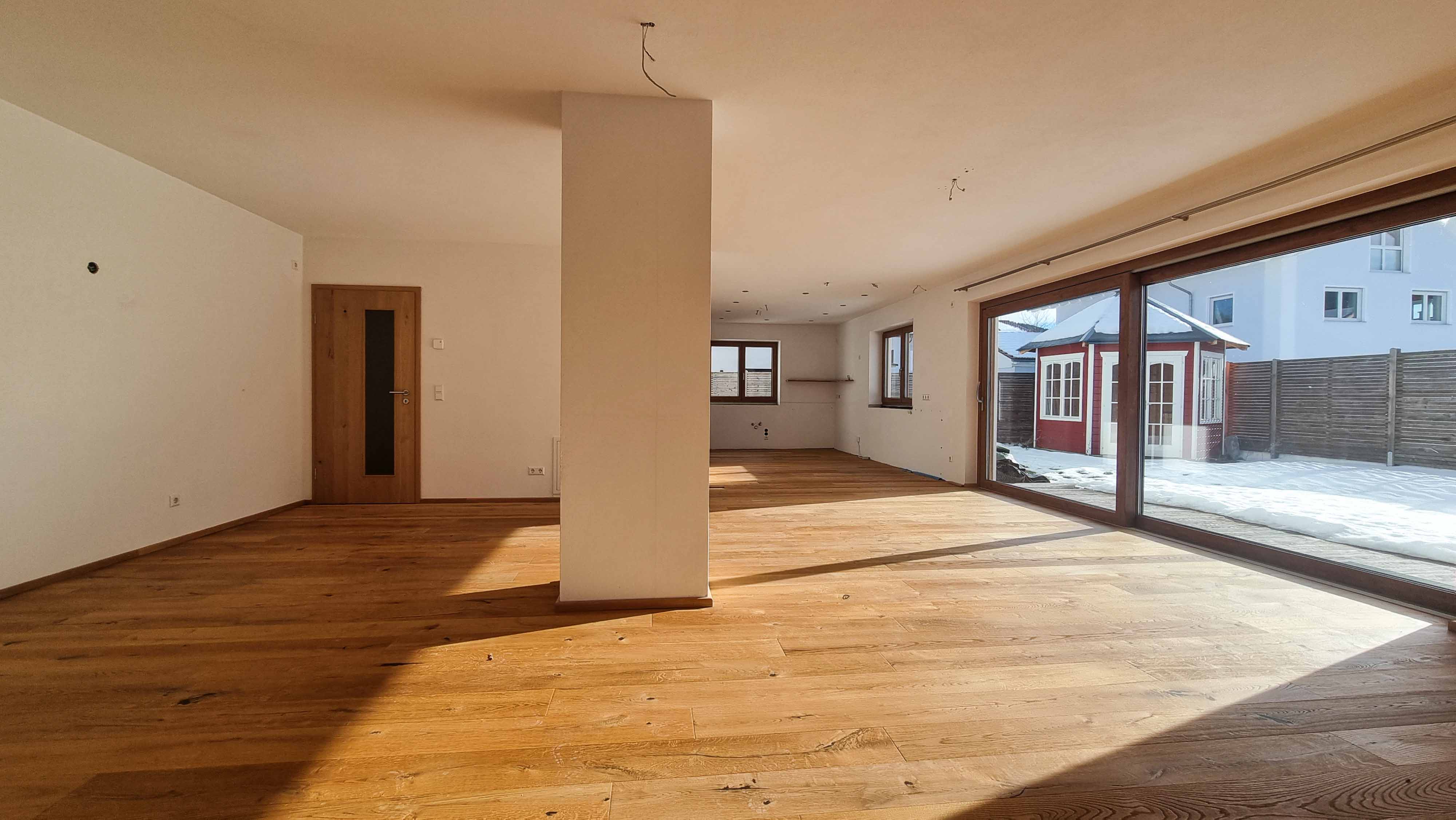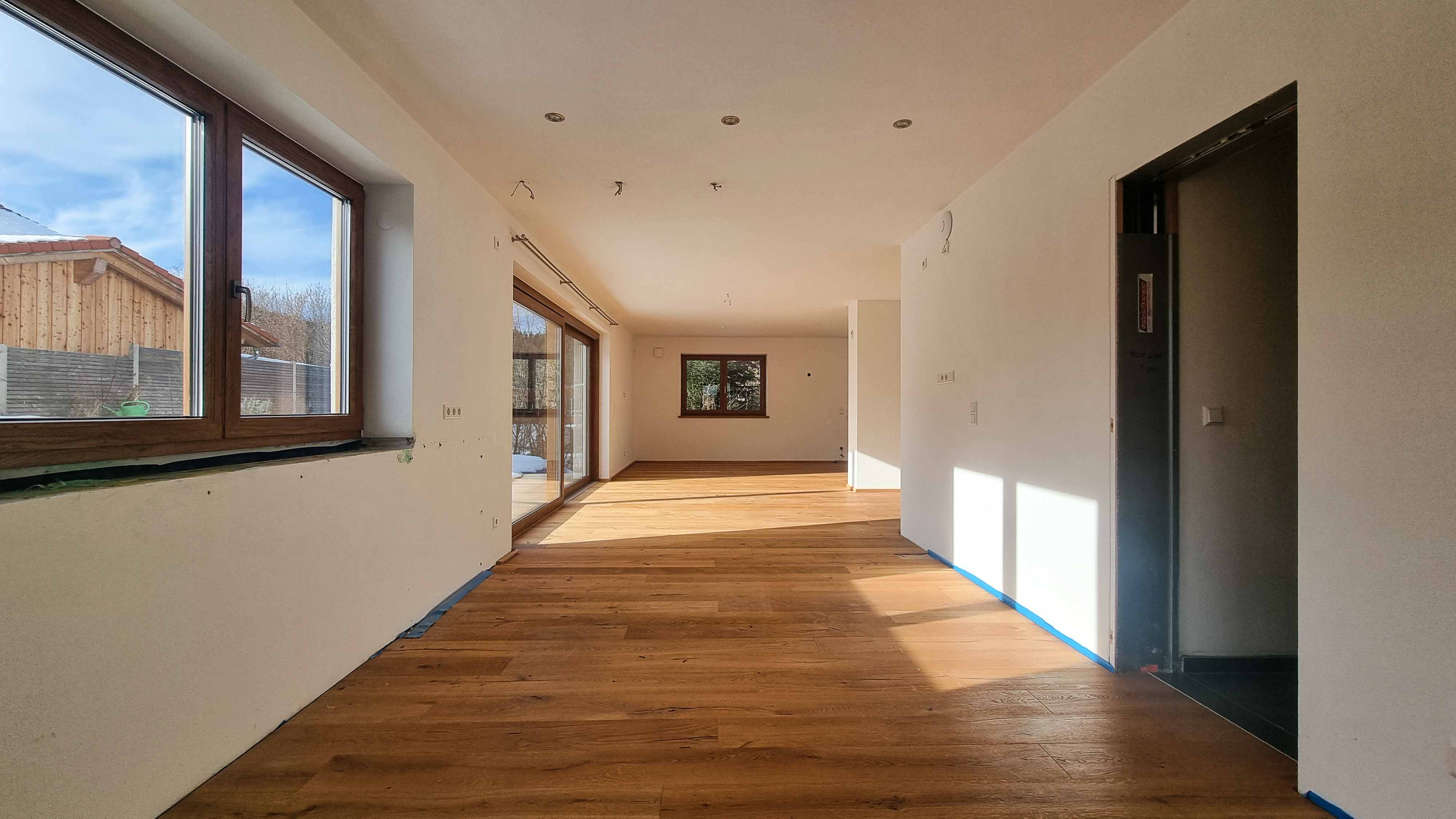 Zwei Bäder im Obergeschoss sowie die Außenanlage auf der Westseite sind noch nicht fertiggestellt.