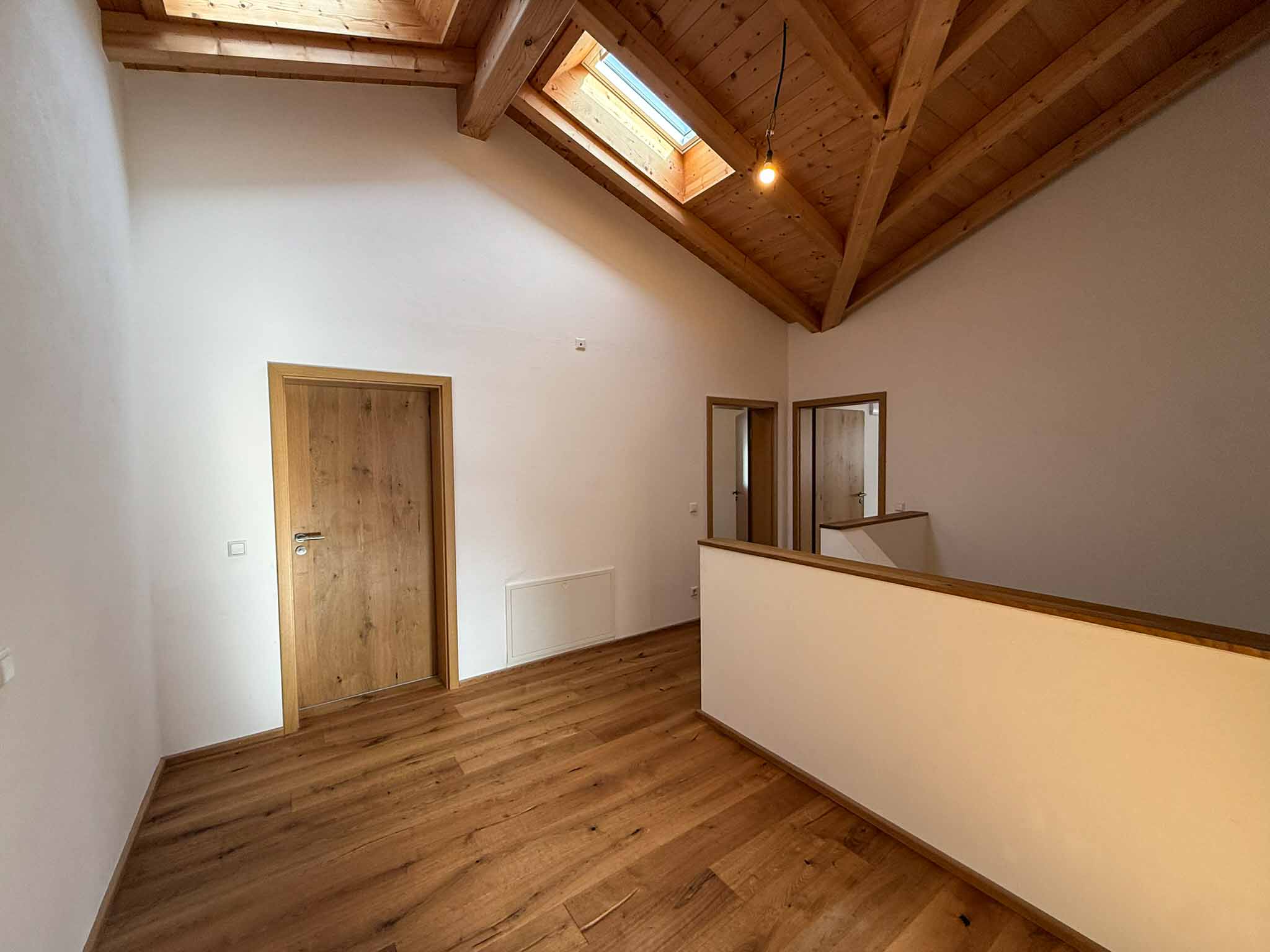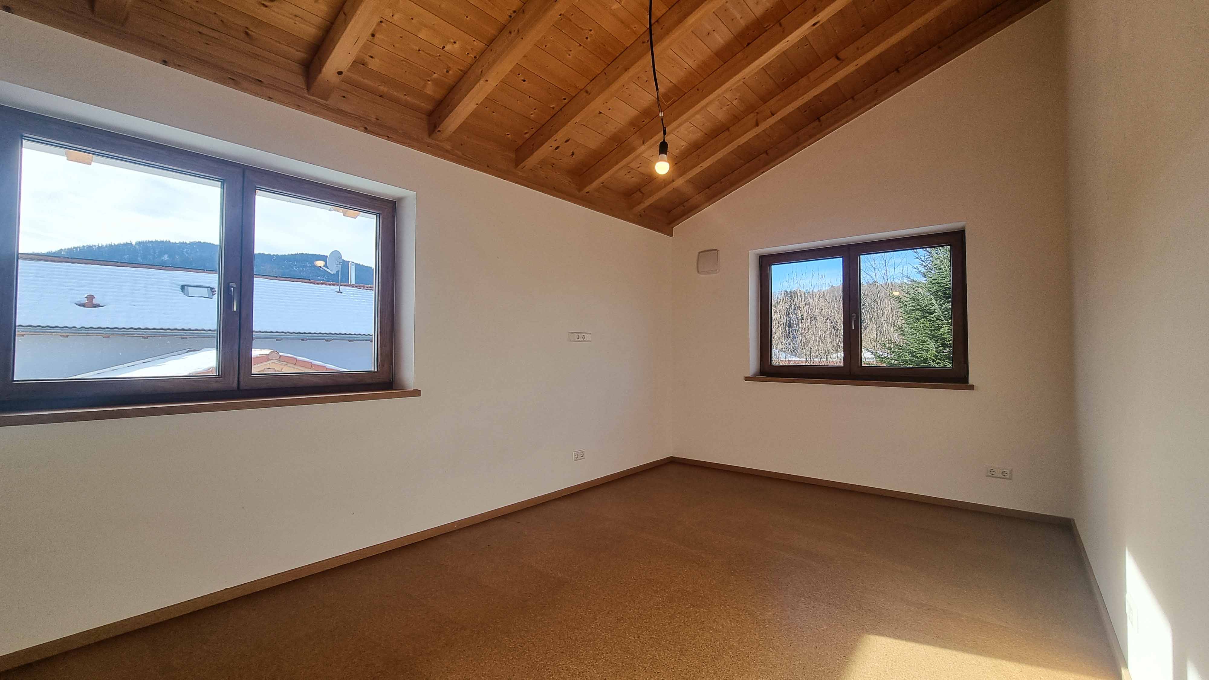 Ein architektonisches Highlight ist der Sichtdachstuhl, der nicht nur optisch beeindruckt, sondern auch das Raumklima positiv beeinflusst. Große, dreifach verglaste Fenster mit erhöhtem Sicherheitsstandard sorgen für lichtdurchflutete Räume und ausgezeichnete Energieeffizienz.