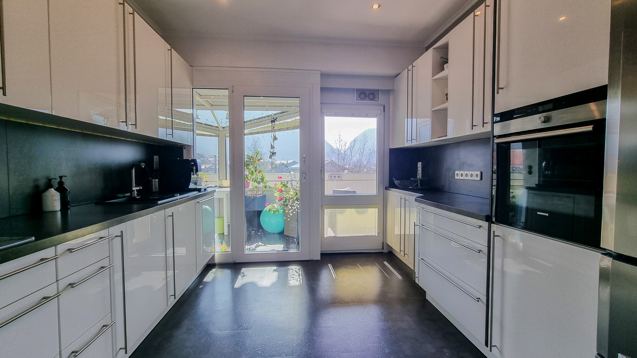 Das Obergeschoss bildet den Hauptwohnbereich der Wohnung. Hier befinden sich ein heller Essbereich, eine moderne Küche mit Zugang zum gemütlichen Wintergarten sowie ein großzügiges, lichtdurchflutetes Wohnzimmer mit Kamin und großer Fensterfront. Zwei gut geschnittene Schlafzimmer mit Einbauschränken, eine begehbare Ankleide sowie ein weiteres Zimmer, das sich ideal als Büro, Gäste- oder Kinderzimmer eignet, bieten viel Platz für unterschiedlichste Wohnbedürfnisse. Das Badezimmer ist mit Doppelwaschbecken, Badewanne, Dusche, WC und Handtuchheizung ausgestattet. Ein besonderes Highlight ist die großzügige, nach Süden ausgerichtete Sonnenterrasse mit herrlichem Blick auf die umliegende Berglandschaft.